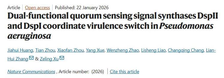 近日,我中心张炼辉/徐泽凌团队在国际知名期刊Nature Communications上发表了题为“Dual-functional quorum sensing signal synthases DspII and DspI coordinate virulence switch in Pseudomonas aeruginosa”的科研论文,揭示了铜绿假单胞菌通过DSF家族群体感应信号调控其急性-慢性致病模式转换的作用机制。