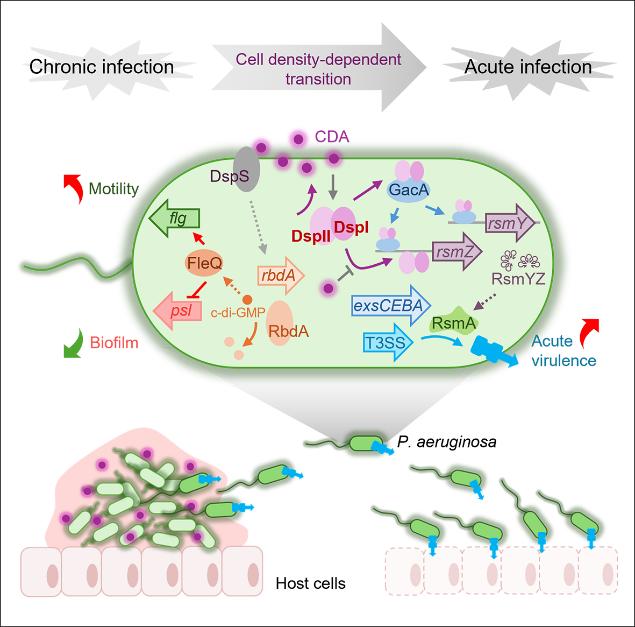 铜绿假单胞菌是引起医院内感染的常见病原菌之一,尤其对烧伤烫伤、术后等免疫力低下人群可造成严重感染。该菌难防难控原因在于其能够根据环境变化重新编程致病基因的表达程序,产生相应致病因子,从而逃逸人体免疫反应、引发急性侵染或慢性侵染。当前的致病机理研究多集中于急性侵染或慢性侵染两个不同的致病模式,对该菌如何协调两个不同致病模式之间转换的认知极为有限。
